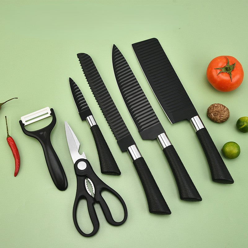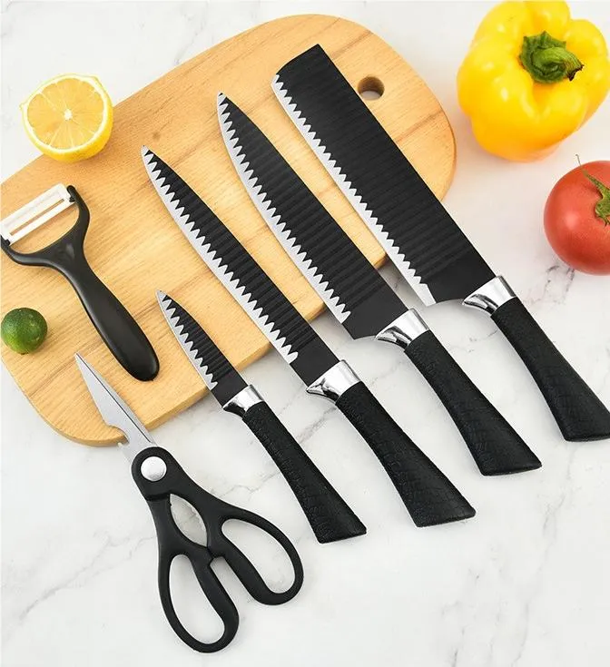 This Versatile Knife Set includes a Chef Knife, Carving Knife, Small Cleaver, Paring Knife, scissors, and ceramic peeler, catering to all your culinary needs. Plus, its anti-slip handle design ensures precision and safety in every slice.